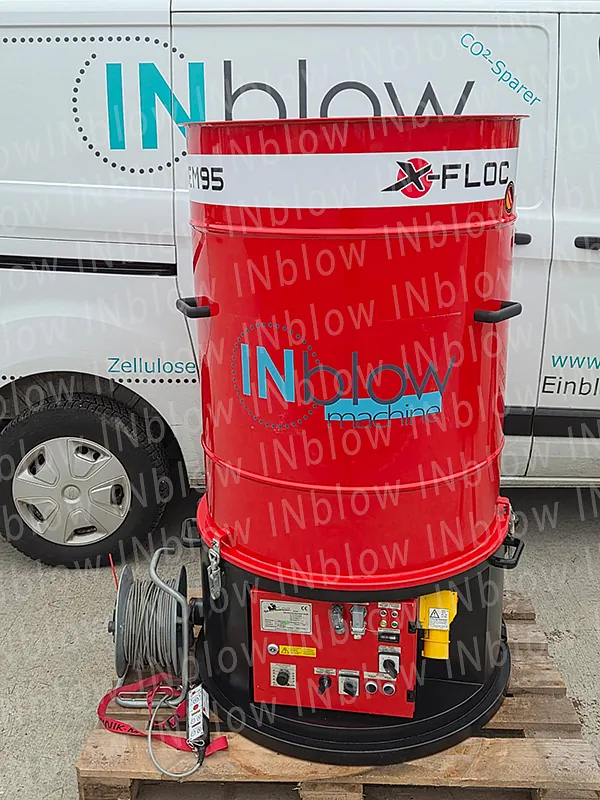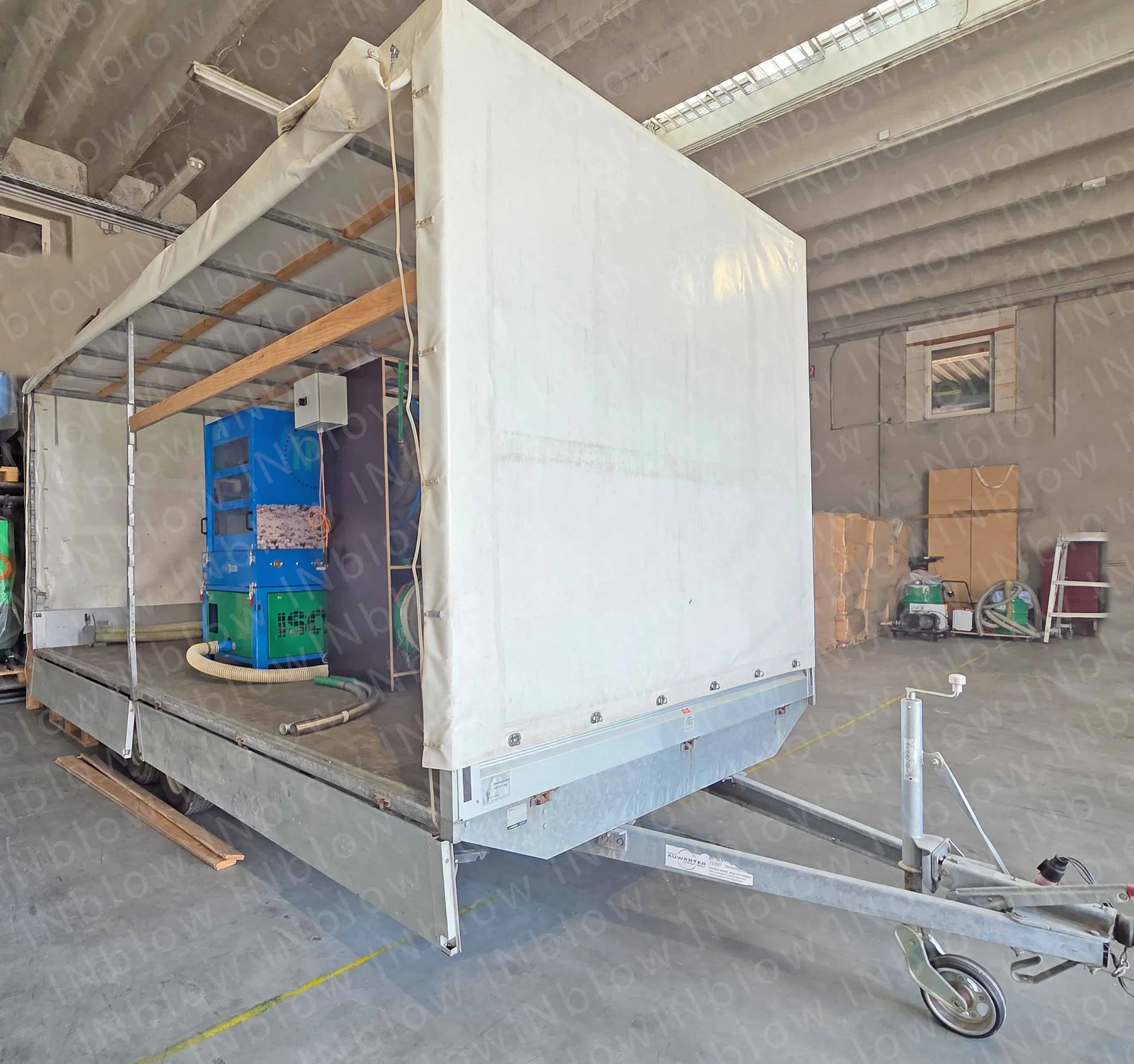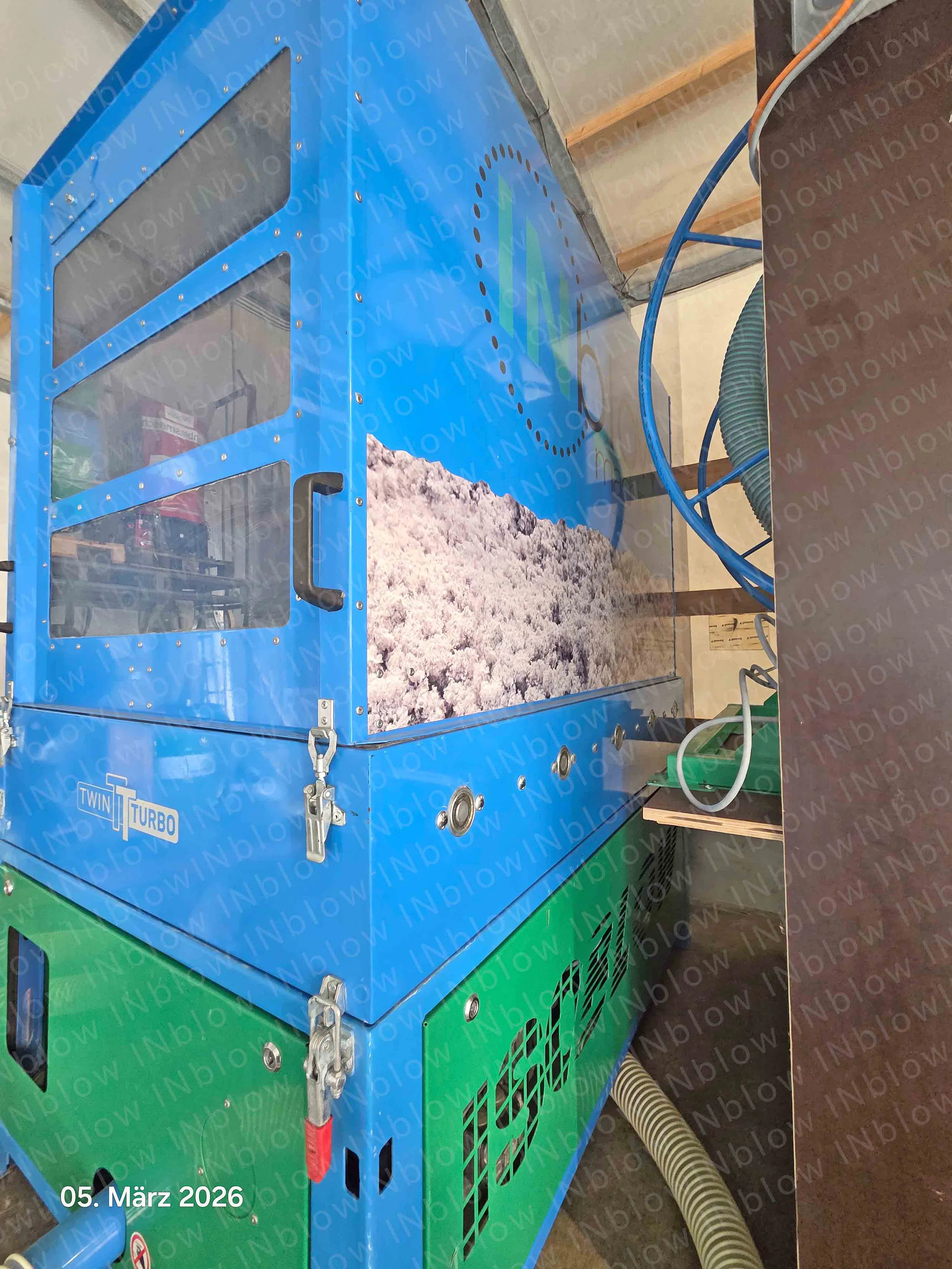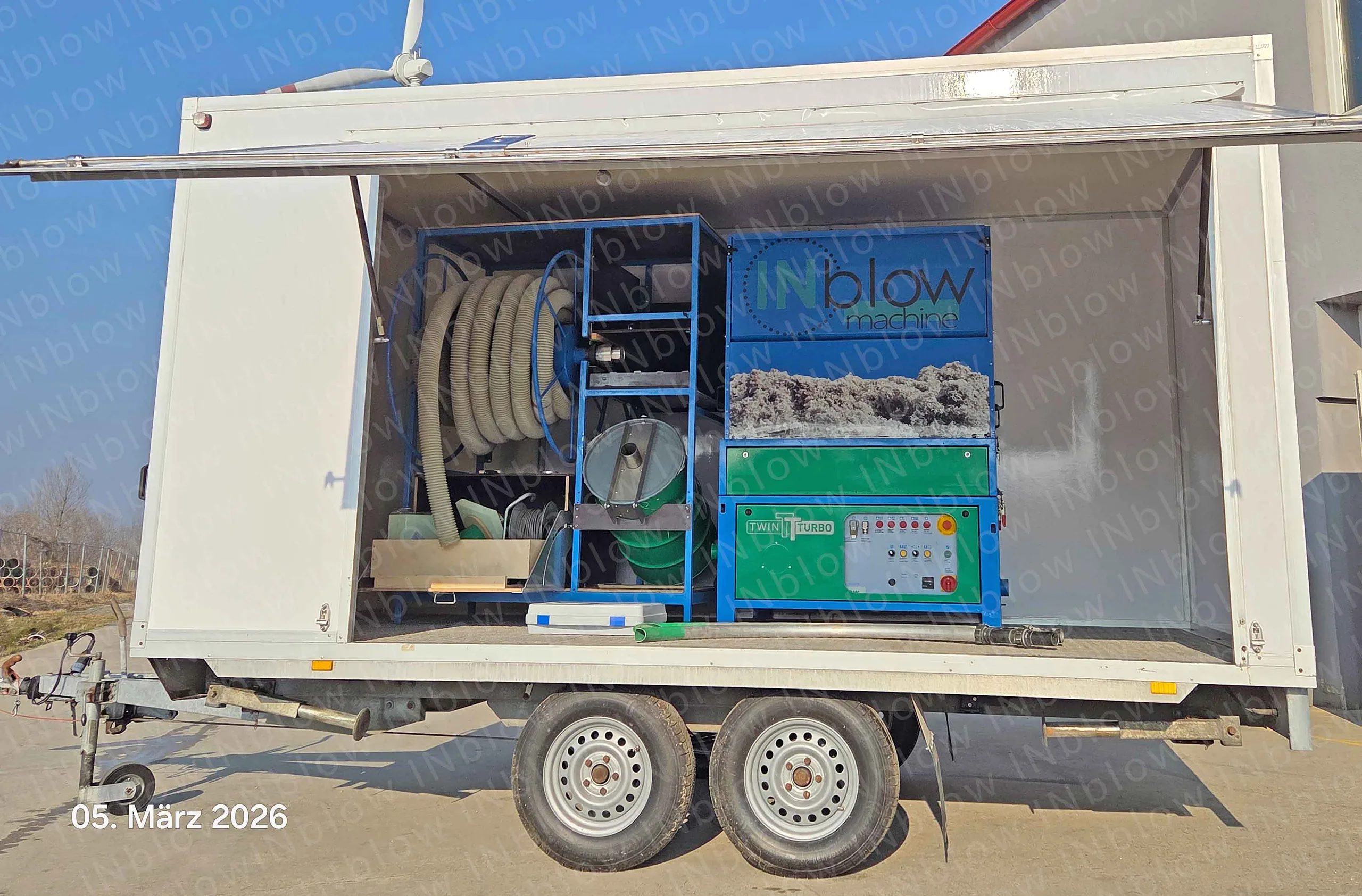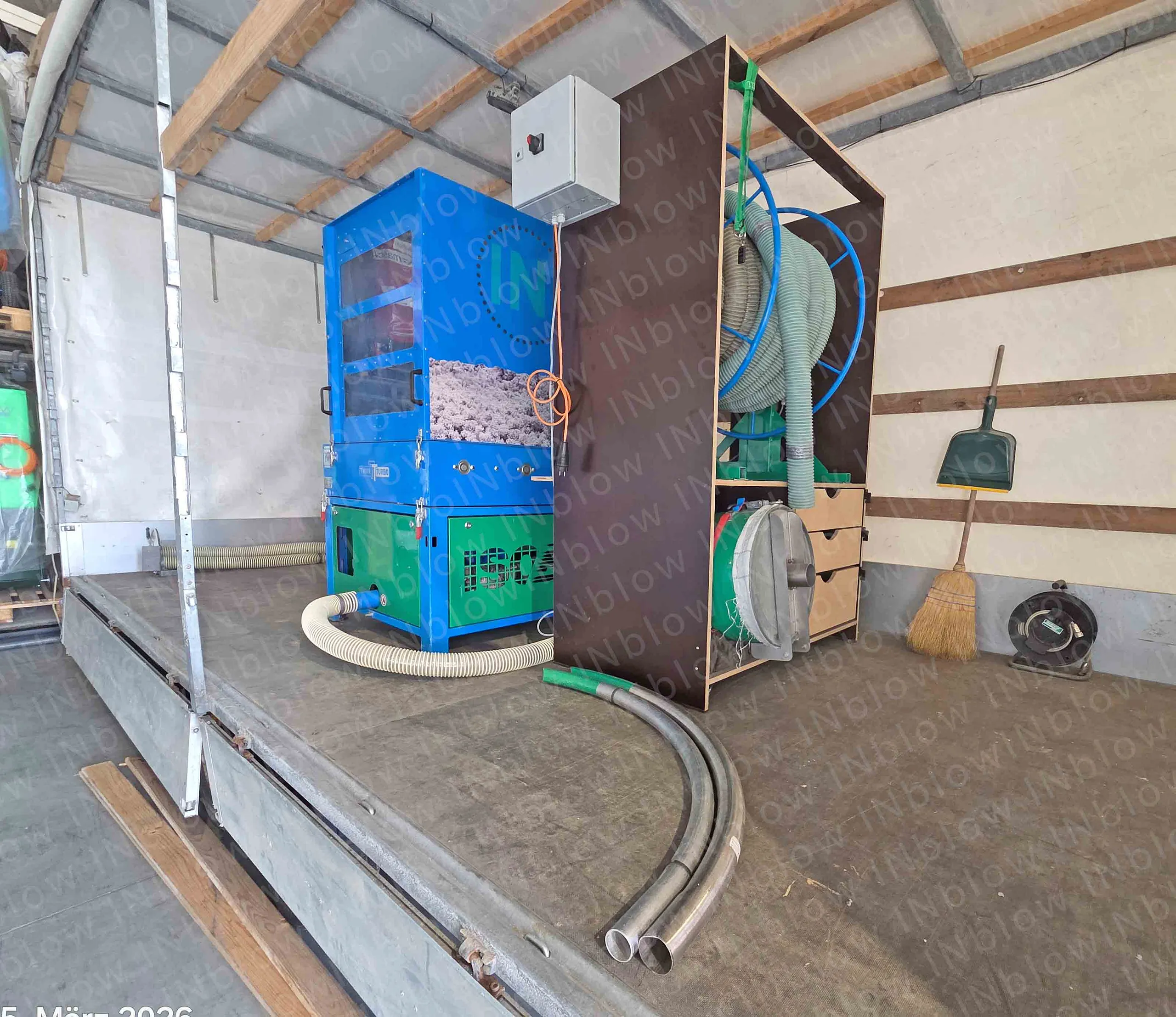 Inside ist eine ISOblow Titan - ein Möbel mit elektrischem Schlauchwagen (Hand und mit Funkfernbedienung steuerbar) - ein Absaugfass - eine Flockenweiche und zwei Einblaslanzen.