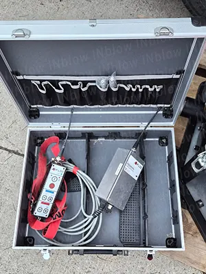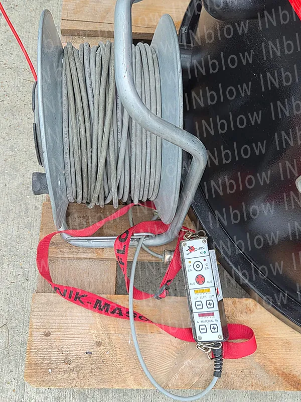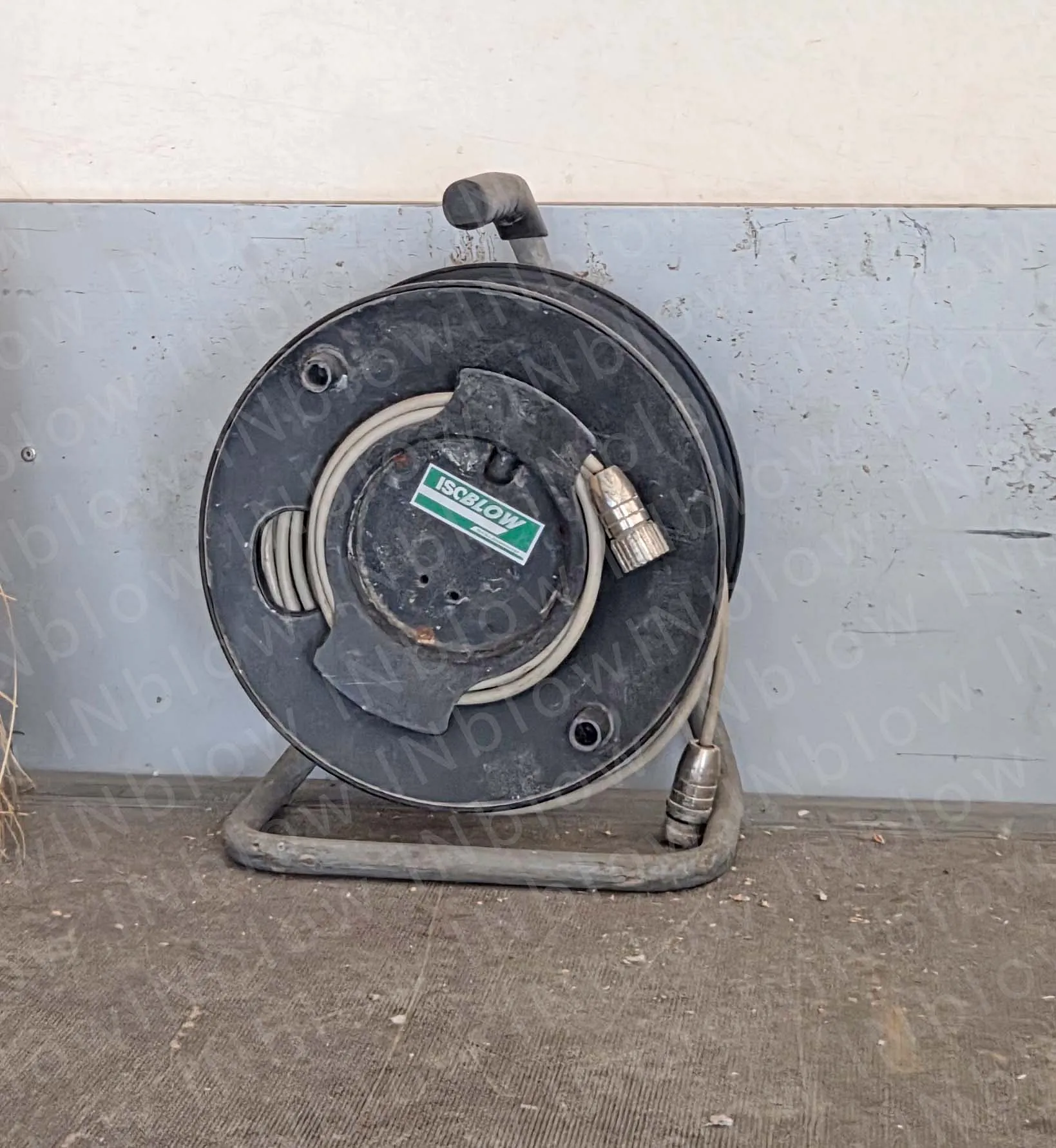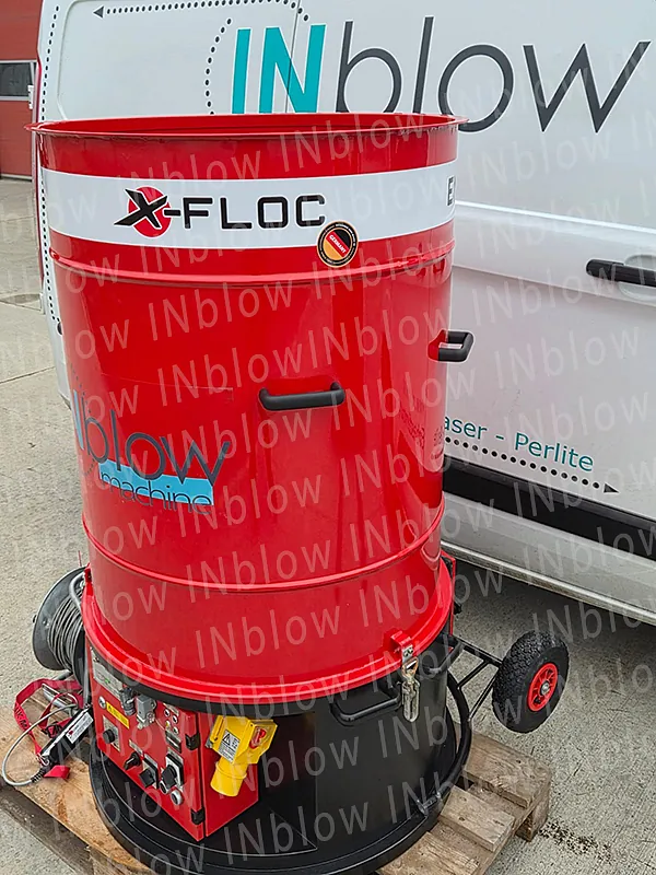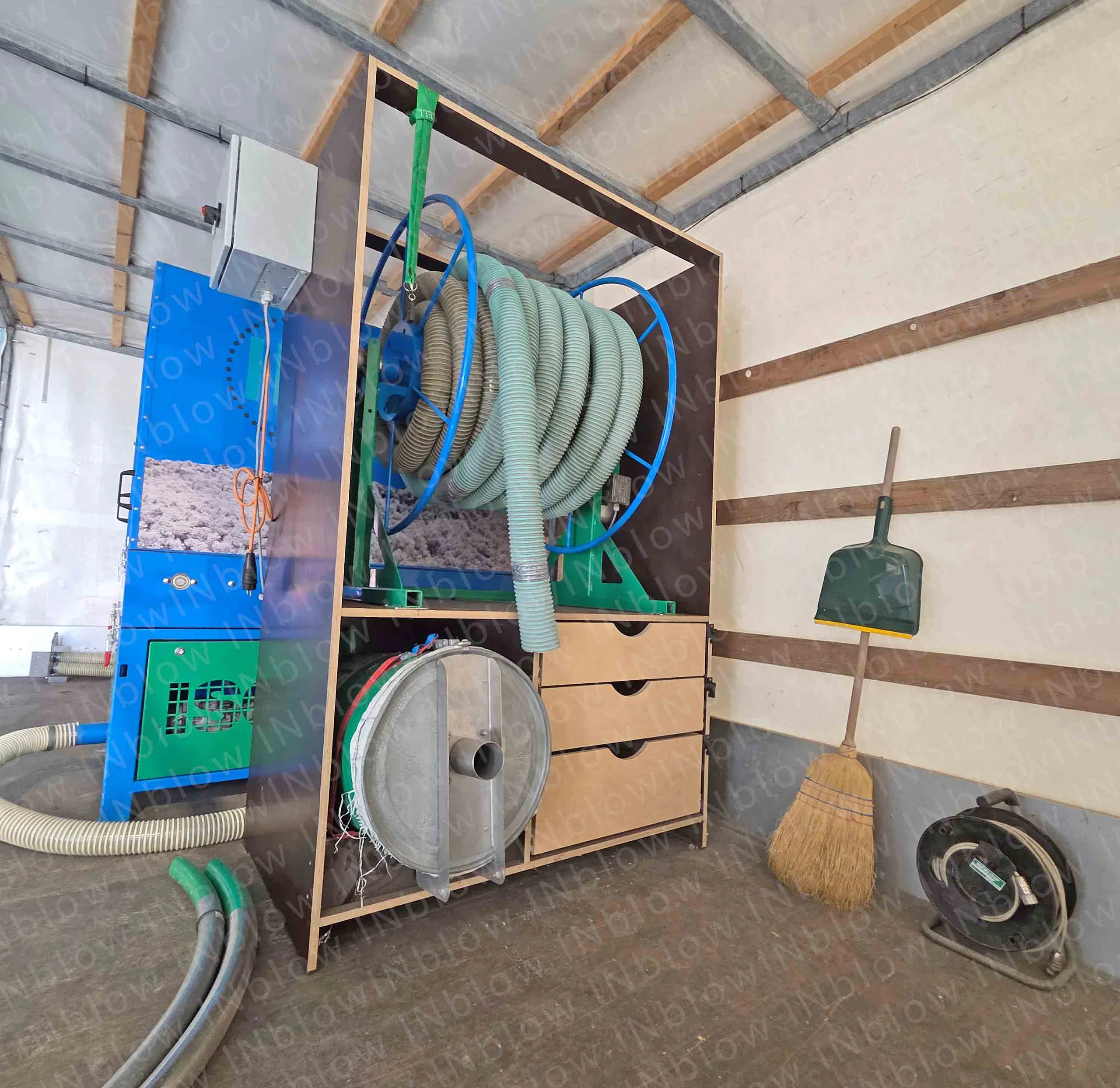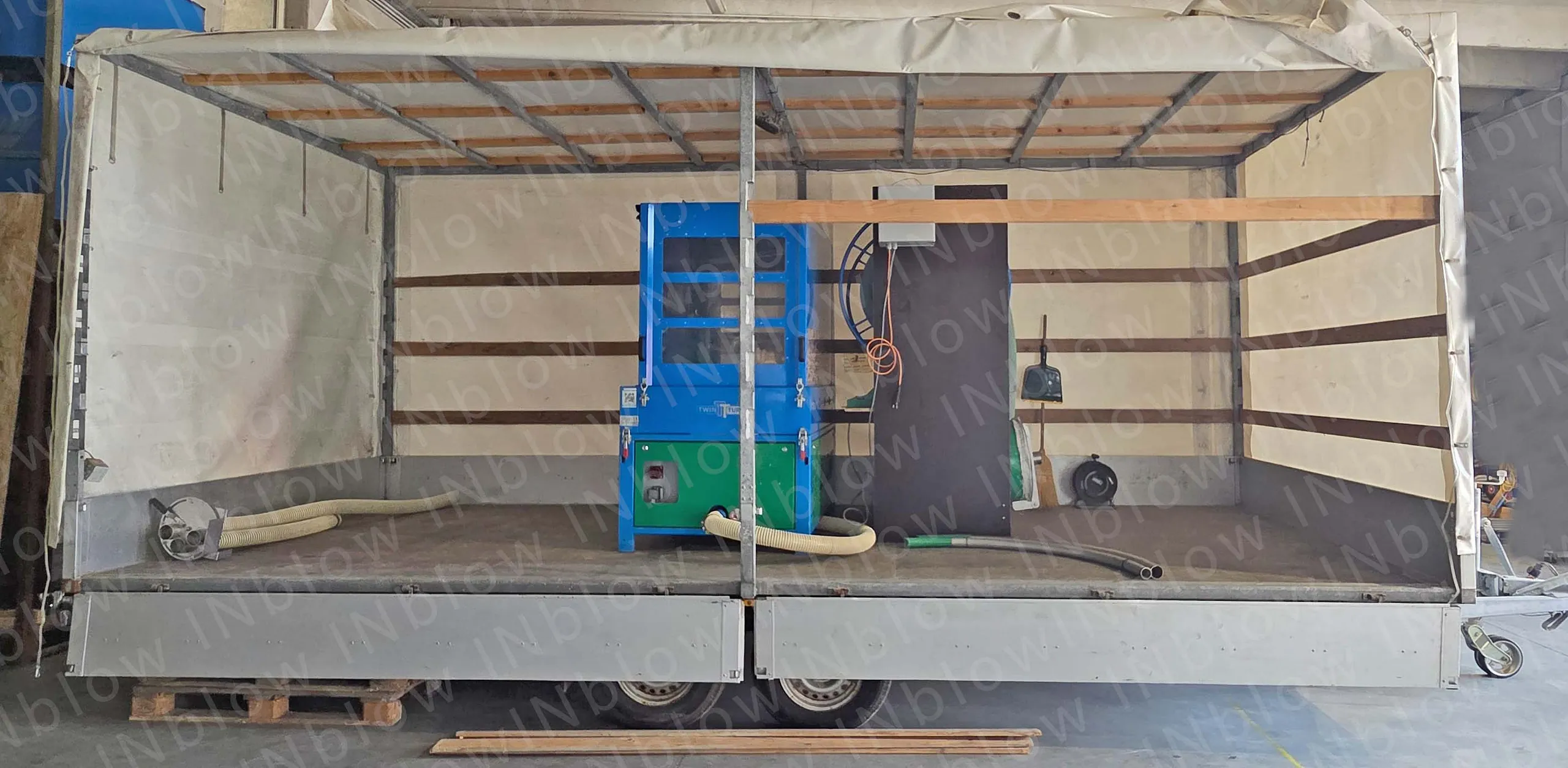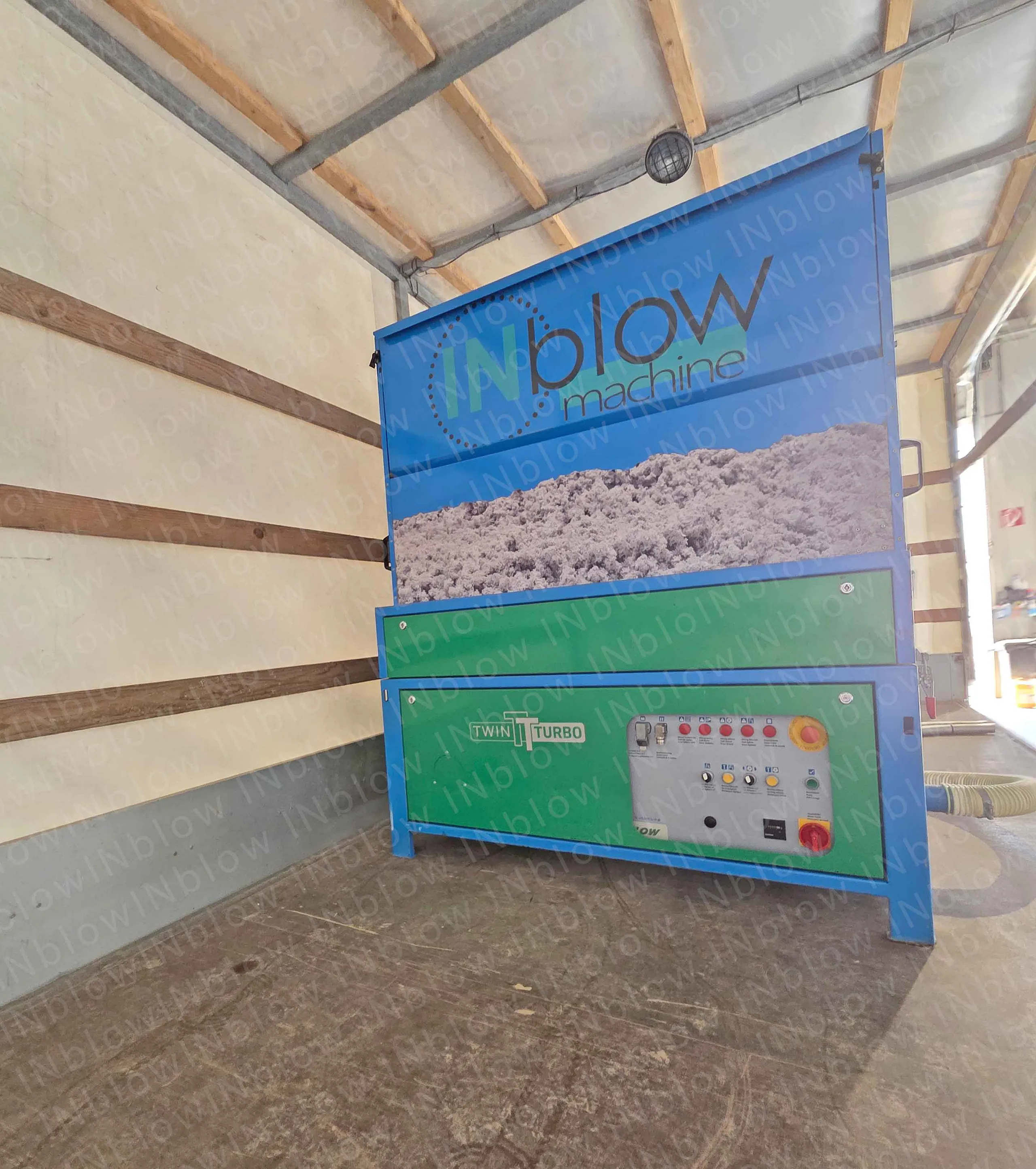 Inside ist eine ISOblow Titan - ein Möbel mit elektrischem Schlauchwagen (Hand und mit Funkfernbedienung steuerbar) - ein Absaugfass - eine Flockenweiche und zwei Einblaslanzen.